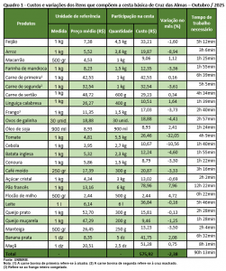 Quadro 1 – Custos e variações dos itens que compõem a cesta básica de Cruz das Almas-Outubro/2023